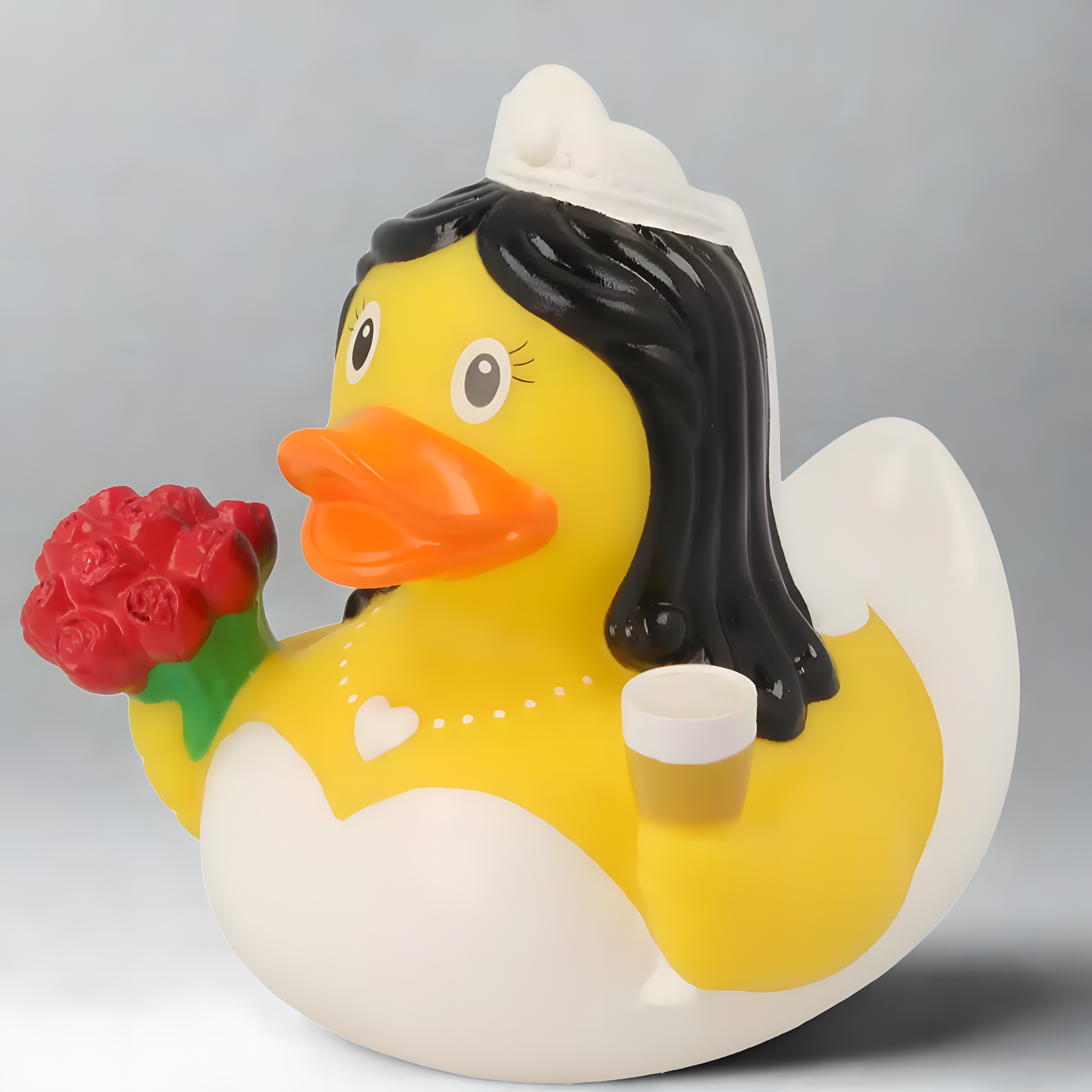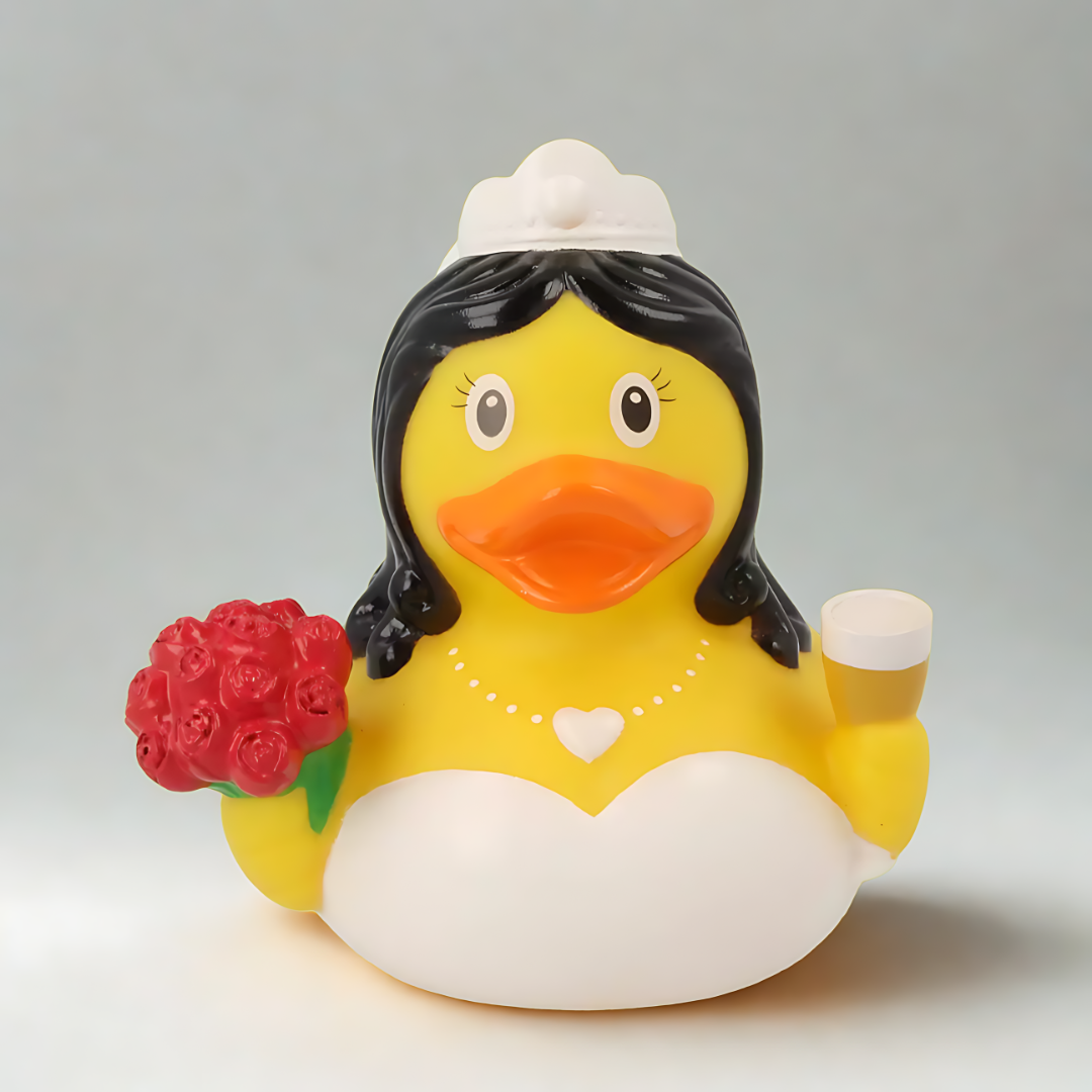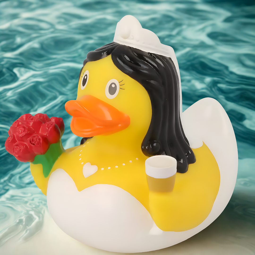 Celebrate love with the Blushing Bride Rubber Duck from Duck World! Dressed in a charming bridal gown and veil, this rubber duck adds a touch of romance and whimsy to any setting. Perfect for wedding favors, bridal showers, or as a sweet gift for the bride-to-be, it's designed to float gracefully in the bath or adorn any shelf with love. Make your special day even more memorable with this adorable bride duck, a symbol of joy and new beginnings.
