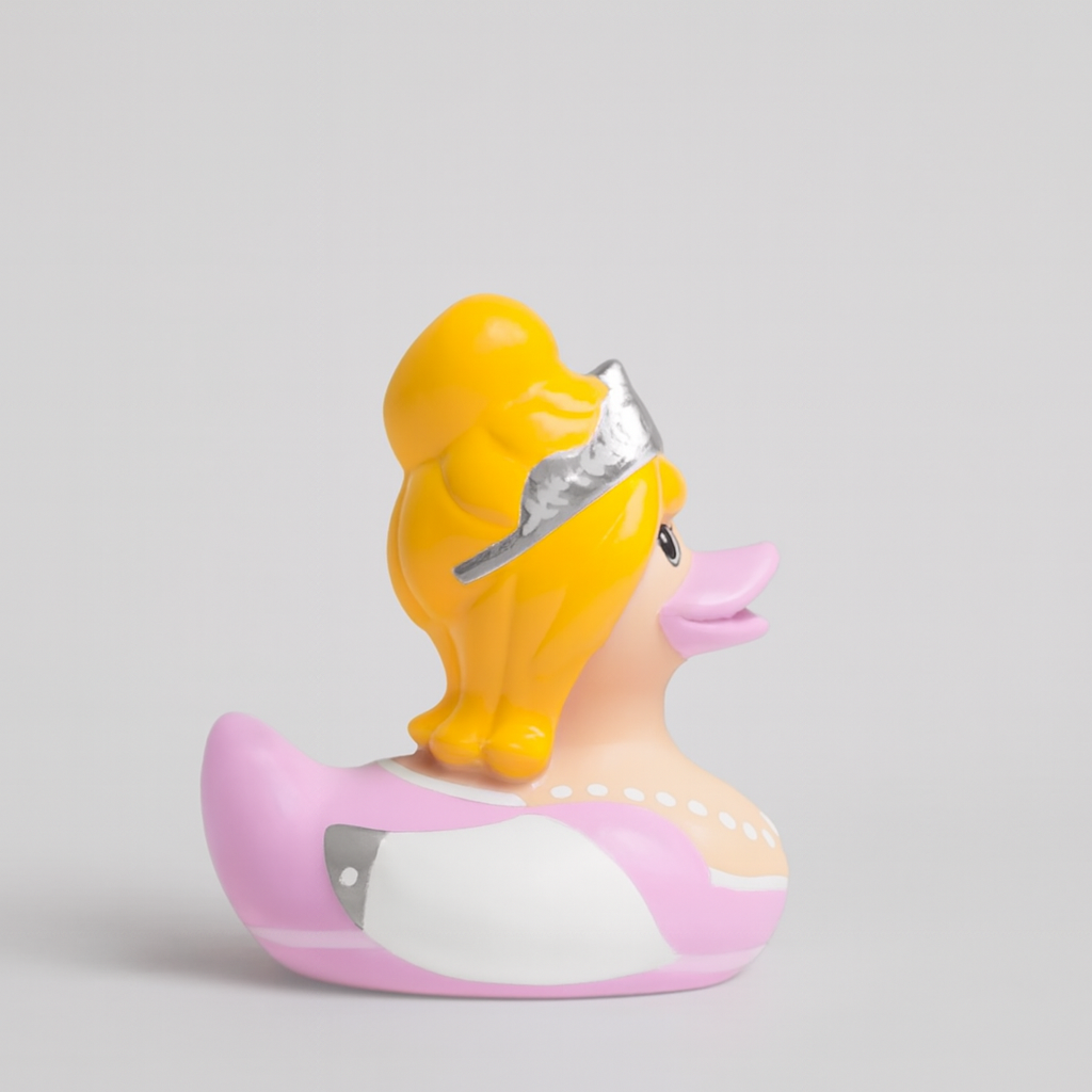 The beautiful princess rubber duck wears a sparkling crown and an elegant dress in soft pink. She embodies the grace and delicacy of a princess. The royal rubber duck is an adorable accessory that encourages children's imagination and creativity and reminds adults of their dreams and wishes.