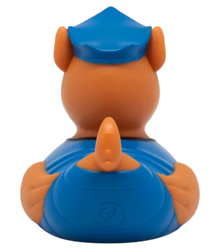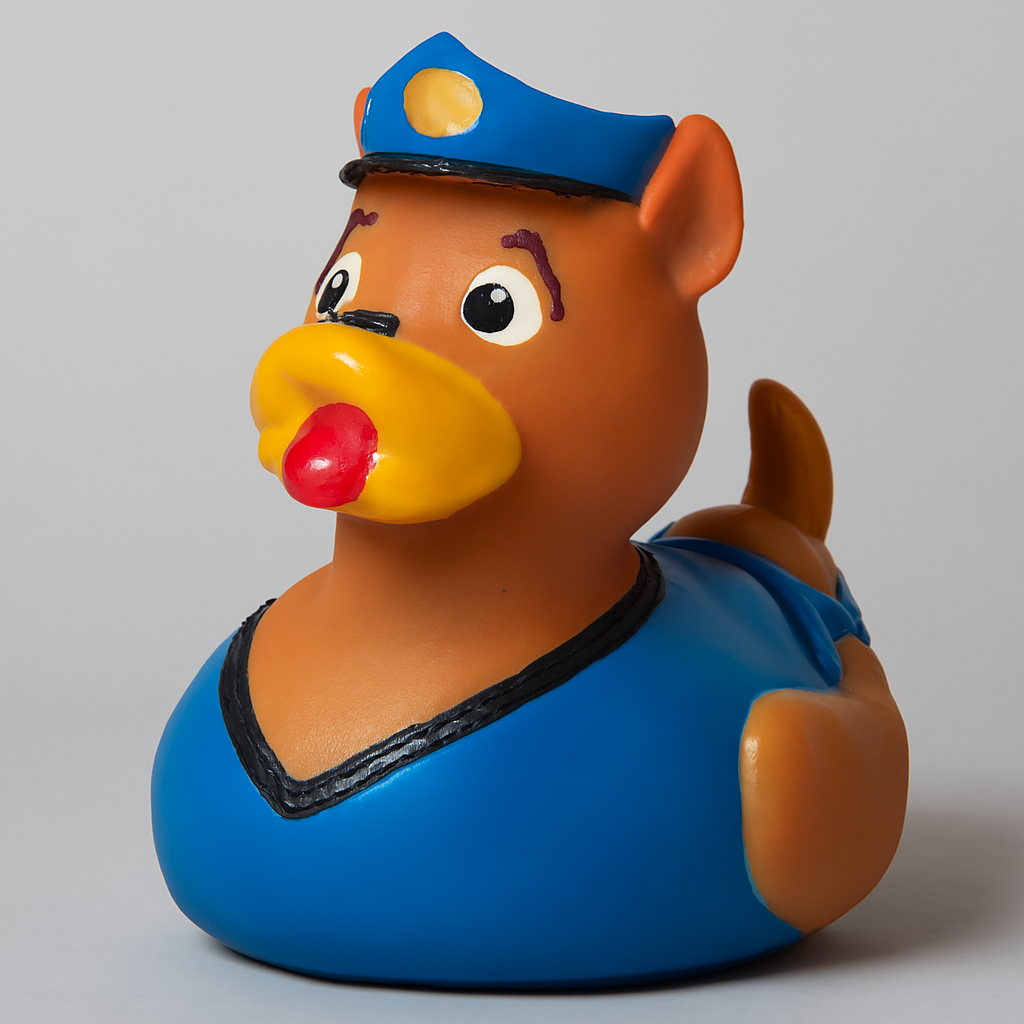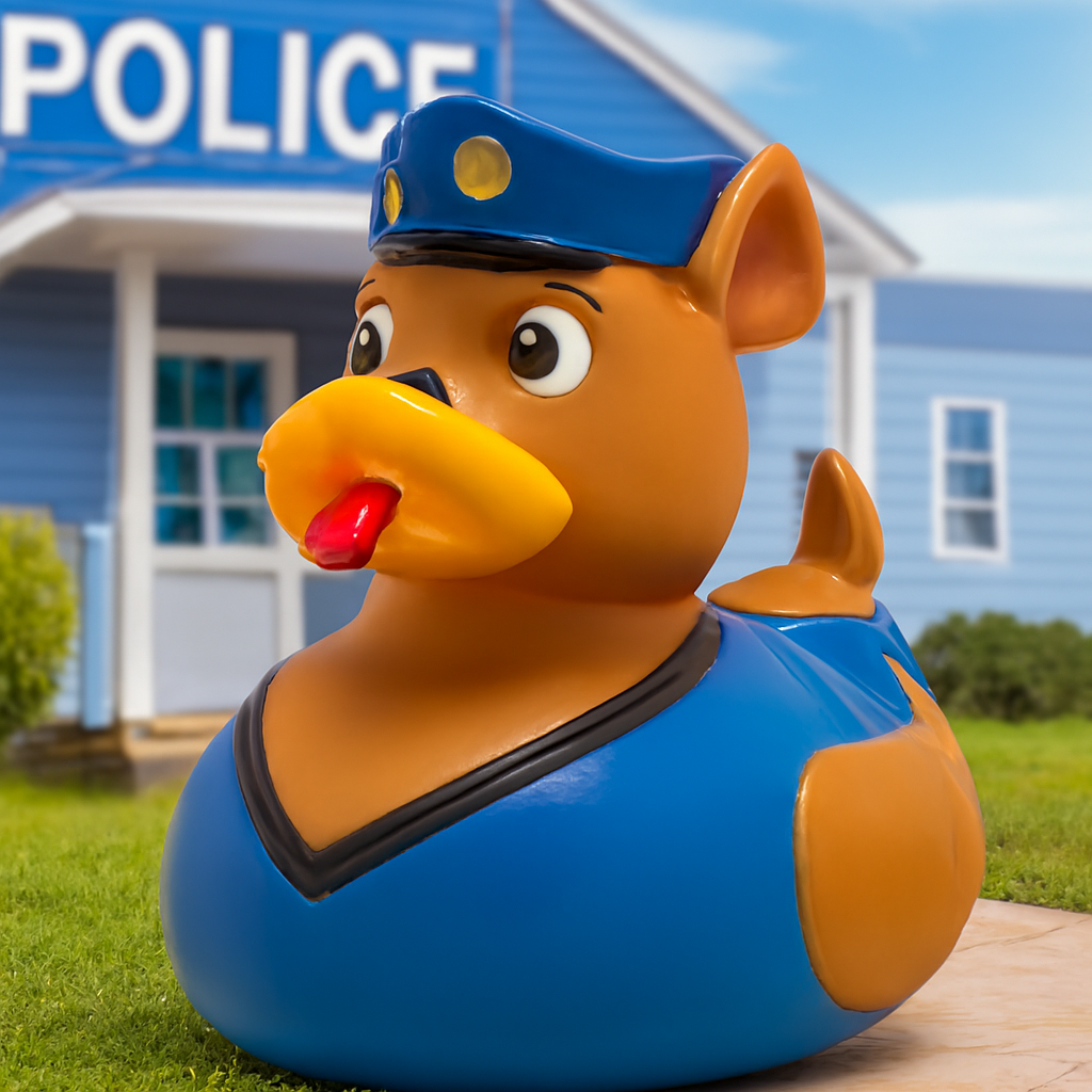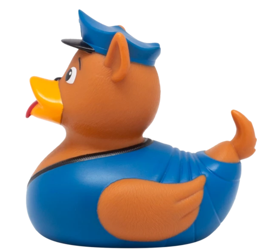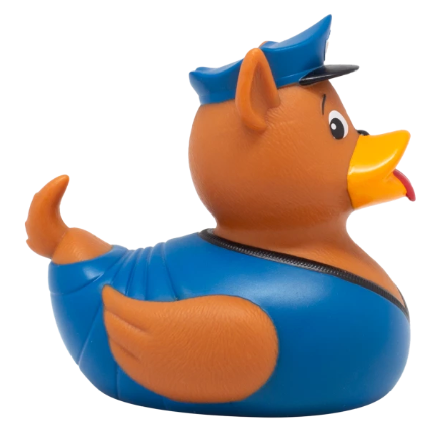Get ready to have the cutest, yet most intimidating police dog on your side with this rubber duck toy! Its playful design is perfect for a fun bath time, but also serves as a quirky desk accessory or stress reliever. Show off your love for law enforcement and dogs with this one-of-a-kind product that will bring a smile to your face every time. Easily make any day a little brighter with this police dog rubber duck by your side (or in your tub)!